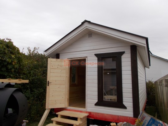 Объект был построен за 10 дней, включая установку свайно-винтового фундамента и полную отделку бани снаружи и внутри под ключ. Особенность наших работ в том, что после отъезда бригады с участки ничего не нужно доделывать. В бане уже есть печь, свет, подведена вода.