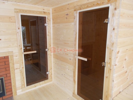 Баня на фотографии построена из сухого профилированного бруса камерной сушки