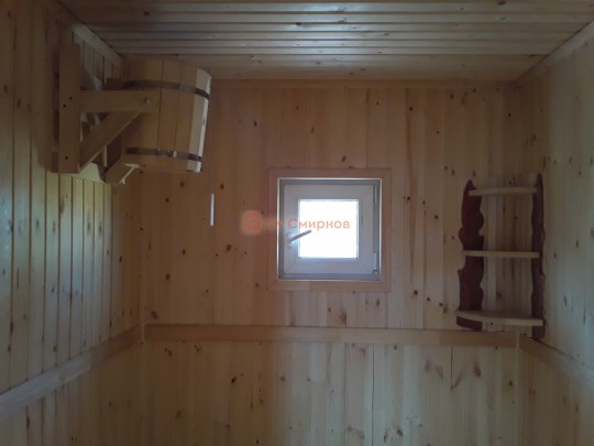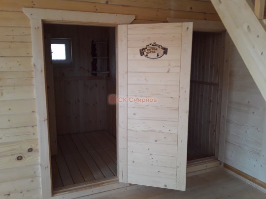 Из профилированного сухого бруса 9х14см, 14х14 см или 14х19 см. Сборка сруба в теплый угол на нагеля или гвозди 200 мм со сверлением отверстия в верхнем брусе (в зависимости от вида бруса).