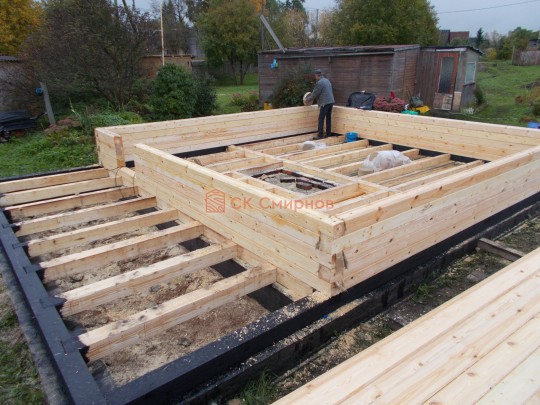 Лаги, обвязку и черновой пол обрабатываем раствором био огне защитой ( зимой оговариваются отдельные условия ), в основном красный цвет, но может быть и бесцветная обработка.