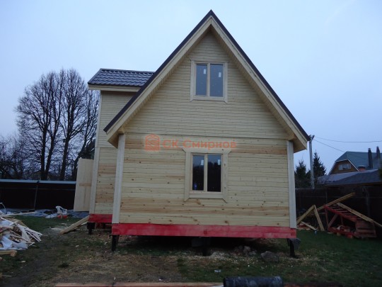Из профилированного сухого бруса 9х14см, 14х14 см или 14х19 см. Сборка сруба в теплый угол на нагеля или гвозди 200 мм со сверлением отверстия в верхнем брусе (в зависимости от вида бруса).