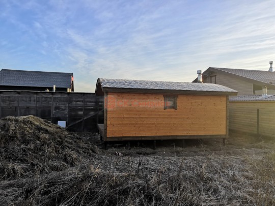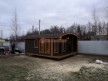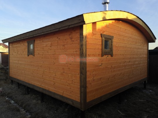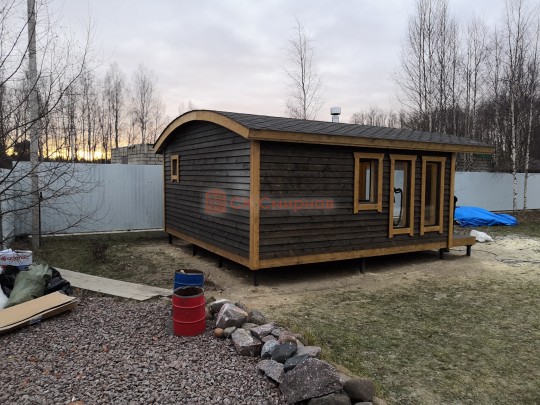 Бани подобного типа мы строим как по каркасной технологии с утеплением и обшивкой доской внахлёст, так и из клееного или сухого бруса. В обоих случаях качество сборки превосходное: баня тёплая, надёжная и очень красивая.