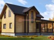 На фото представлен проект надёжного дома №250 габаритами 7.5х9 метров и отличной планировкой общей площадью 124 квадратных метров. Можно выделить несколько особенностей проекта: терраса, эркер, туалет, ванная, санузел, панорамные окна. Особняк полутораэтажный, может использоваться как зимний, для постоянного проживания, коттедж.